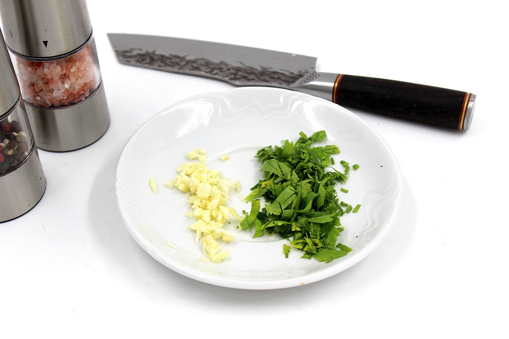 Мелко порубить петрушку и зубчик чеснока.
