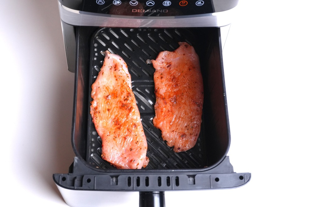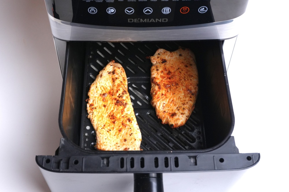 Птицу мне нравится готовить в аэрогриле еще потому, что воздух там циркулирует и сразу запечатывает все соки внутри стейка, делает красивую корочку. Я советую при покупке выбрать аэрогриль с двумя тэнами - сверху и снизу, тогда еда будет пропекаться равномерно, и не придется ее переворачивать.