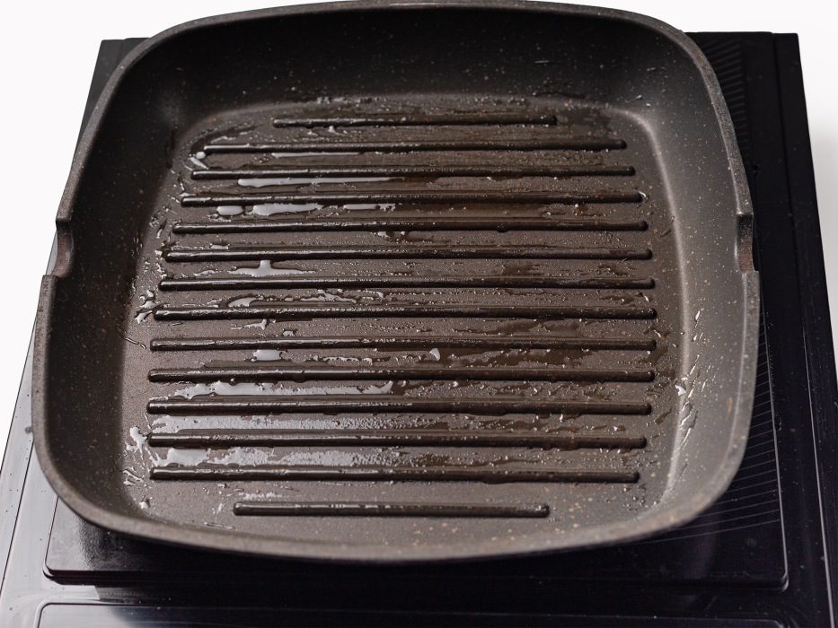 Выложить стейки на разогретую на сильном огне сковородку гриль и готовить 2 минуты с одной стороны.