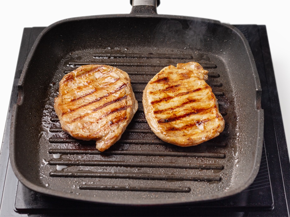 - Куски толщиной 1–2 см лучше всего подходят под сковороду‑гриль: они успевают образовать корочку, а внутри остаются сочными.