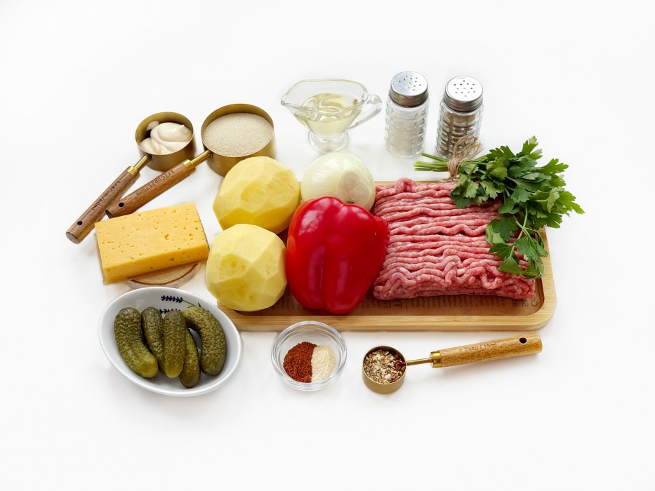 Подготовить продукты для приготовления стожков из фарша в духовке с сыром.