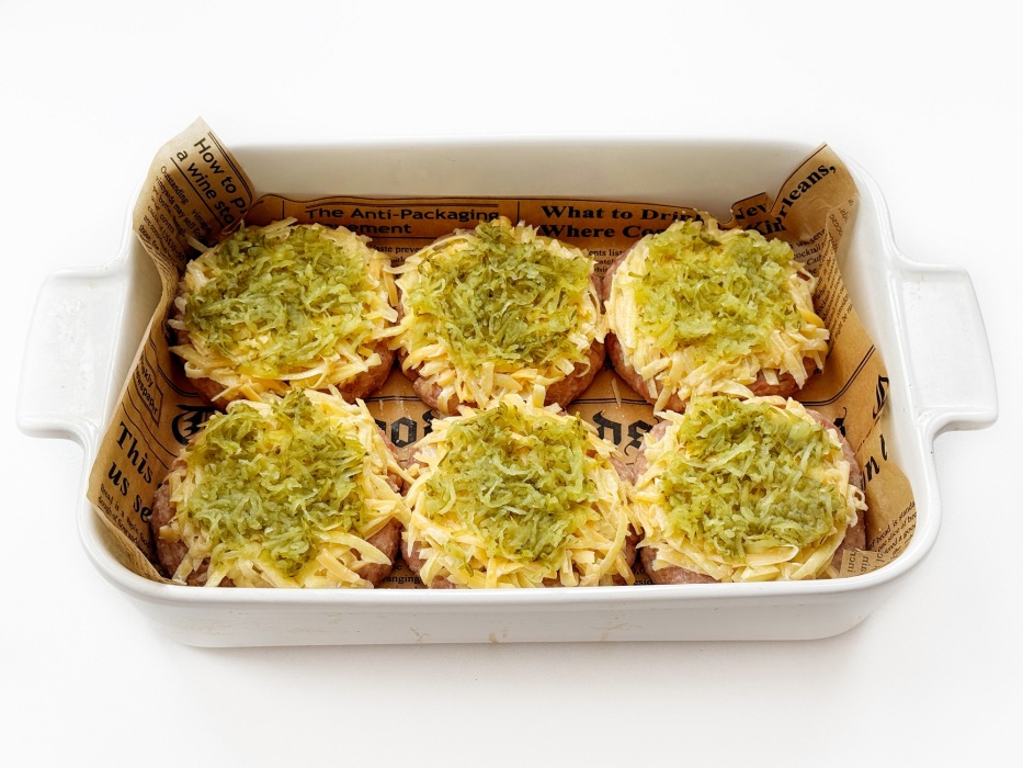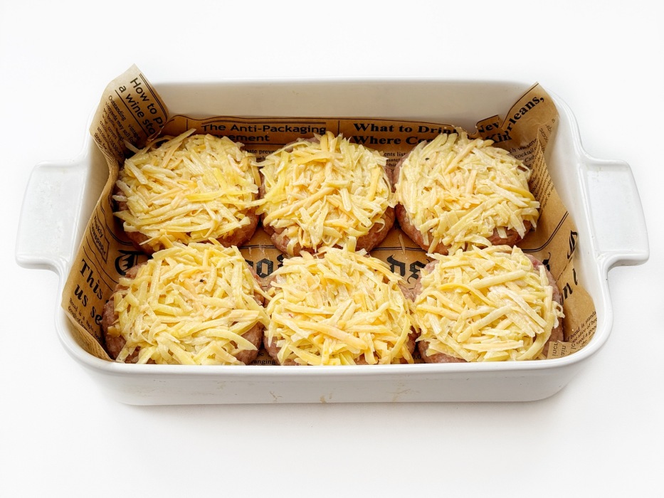 Сформировать из фарша аккуратные круглые лепешки и выложить их в форму для запекания, застеленную пергаментом с маслом.