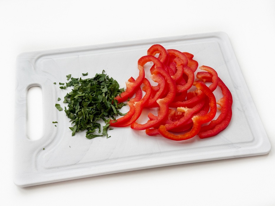Нарезать тонко сладкий перец и измельчить петрушку.