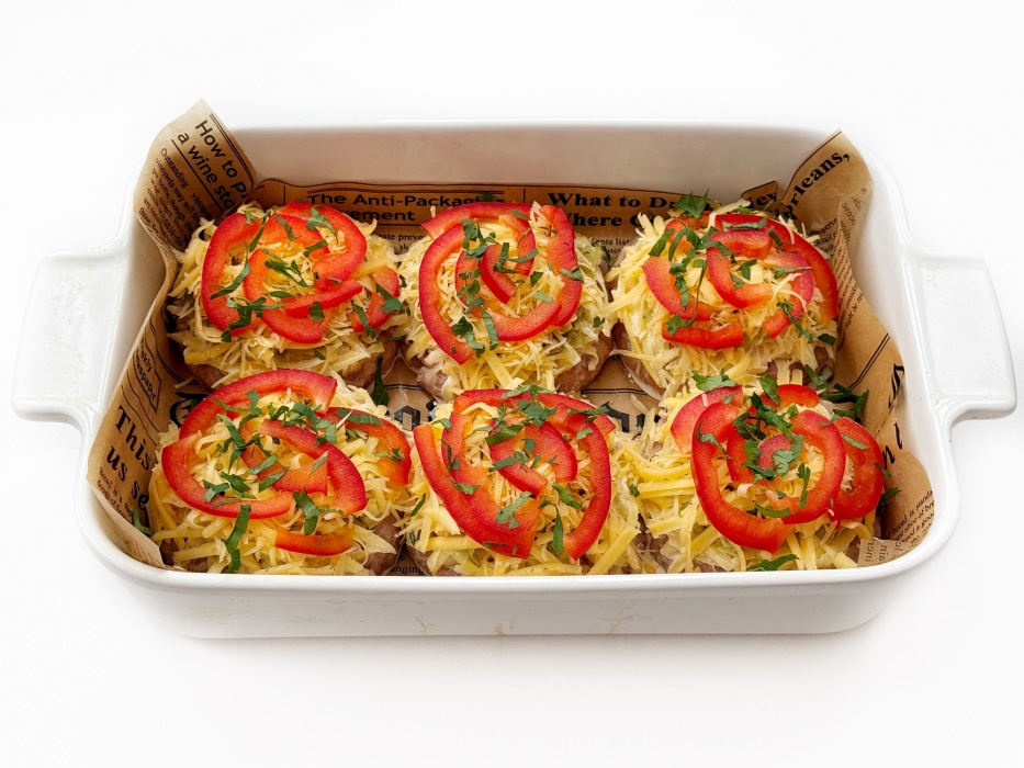 Посыпать оставшимся сыром. Сыр при запекании расплавится и запечатает ингредиенты и сок, образуя красивую румяную шапочку.