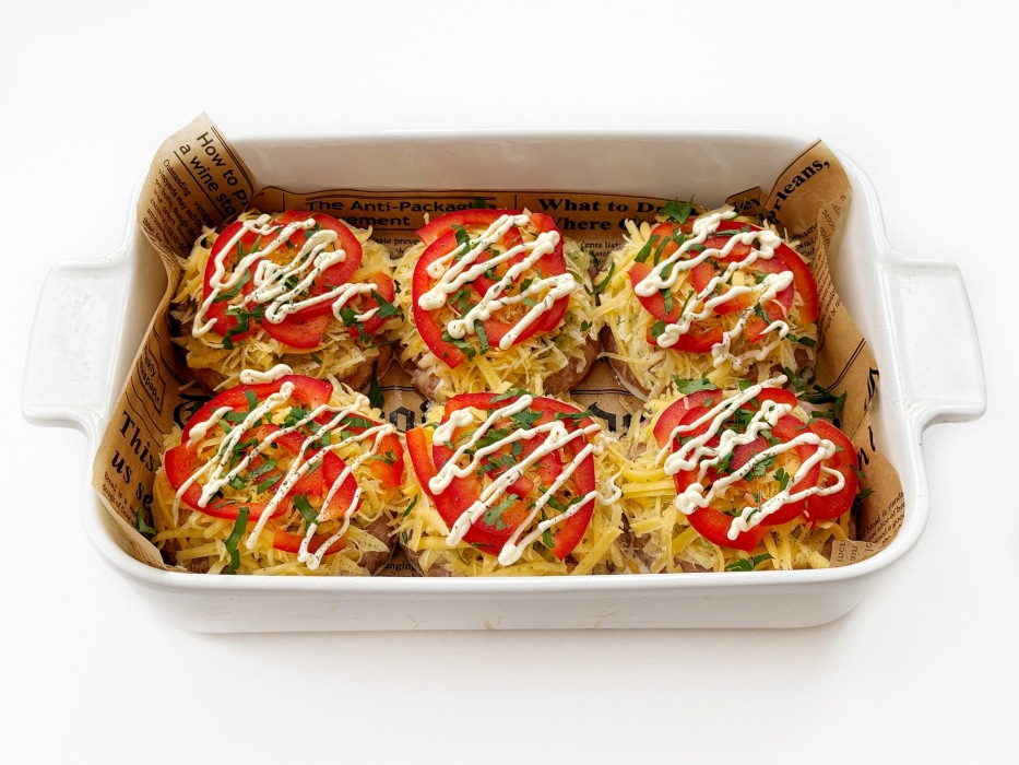 Добавить немного майонеза на каждый стожок. Можно сделать тоненькую сеточку. Отправить форму в разогретую до 180 °C духовку. При желании форму можно прикрыть фольгой на первые 20-25 минут запекания, а затем снять её, чтобы стожки подрумянились и сырная шапочка стала золотистой.