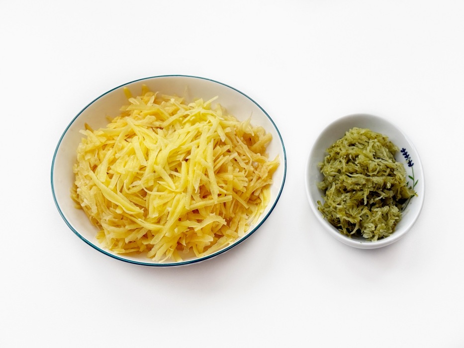 Натереть картофель и огурцы на терке. Если нужно, отжать лишнюю жидкость.