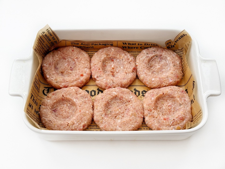 Готовый фарш слегка отбить о дно миски, этот простой прием сделает его плотнее и поможет стожкам сохранить аккуратную форму и не развалится в духовке.