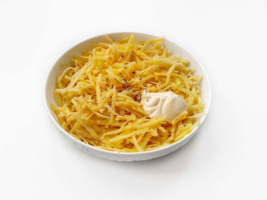 Тертый картофель, если требуется отжать, соединить с сыром, ложкой майонеза, посолить, поперчить.