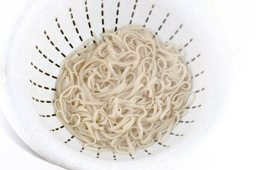 Отварить рисовую лапшу согласно инструкции на упаковке.