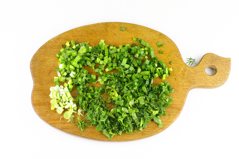 Зелень промыть и обсушить. Мелко нарезать.