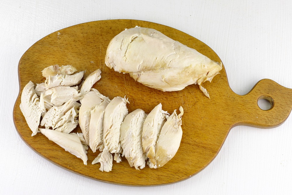 Вареную грудку нарезать порционными кусочками.