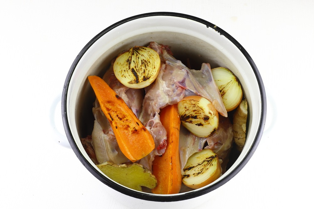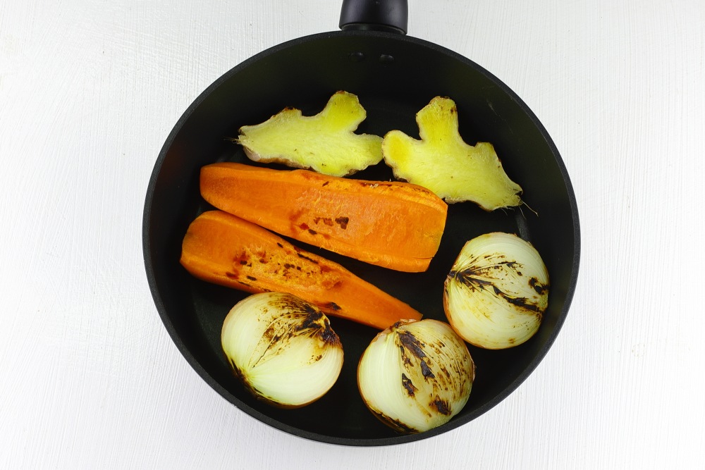 Промыть имбирь и лук, не очищая от кожицы. Морковь очистить и промыть. Обсушить от лишней влаги. Разрезать корнеплоды пополам. Подрумянить на умеренном огне с двух сторон до хорошо золотистого цвета. При обжарке овощей выделяются эфирные масла и ароматы, которые усиливают общий запах бульона. Дополнительно для ароматизации бульона можно использовать пастернак, корень сельдерея, чеснок.