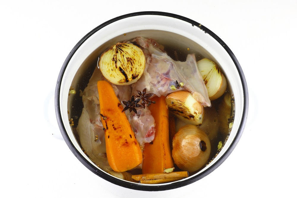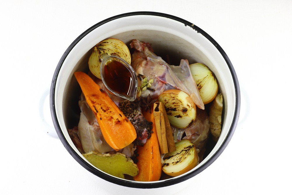 Влить холодную воду, так чтобы все кости и ингредиенты были полностью покрыты. Мне понадобилось 6 л воды. Довести до кипения.