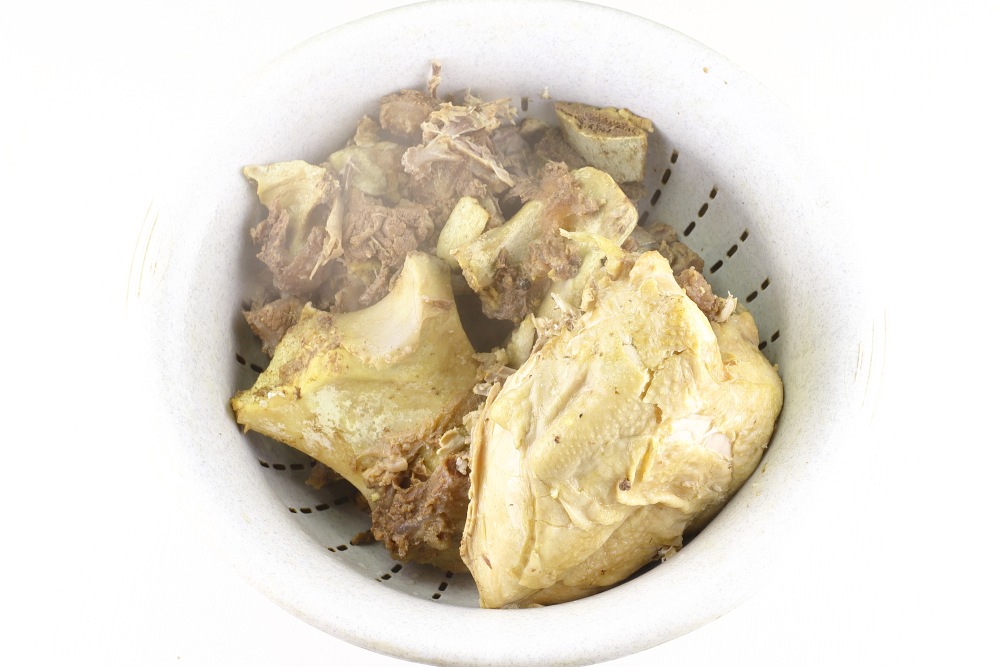 Достать мясо и кости из бульона на дуршлаг. Немного остудить грудку, чтобы с ней удобно было работать.
