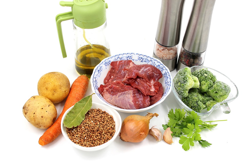 Подготовить ингредиенты для гречневого супа с картошкой и говядиной.