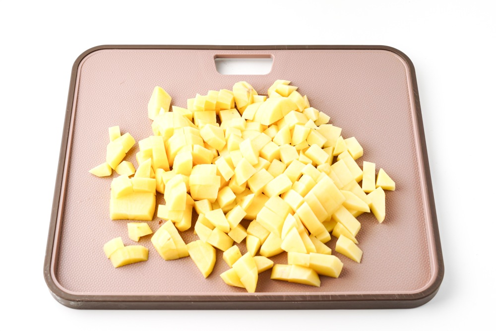 Аккуратно вынуть бедро из кастрюли и отложить на тарелку остывать. Картофель промыть, очистить от кожуры, нарезать средними кубиками одинакового размера, чтобы он приготовился равномерно. Добавить картофель в кипящий бульон и варить до мягкости.