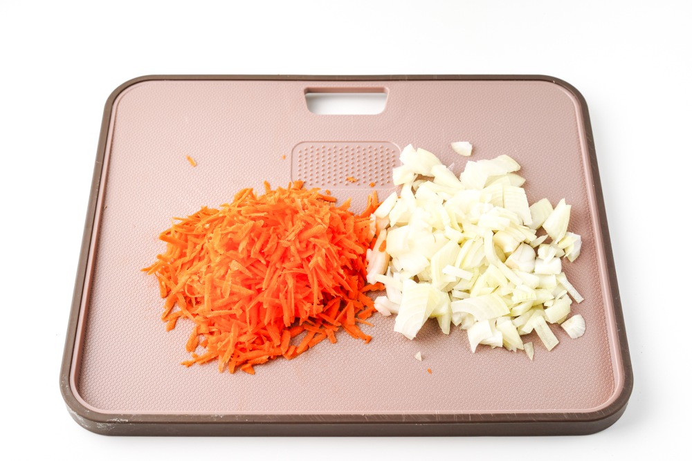 Морковь тщательно промыть, очистить от кожуры и натереть на средней терке. Лук очистить, промыть и нарезать небольшими кубиками, стараясь сделать кусочки одинаковыми.