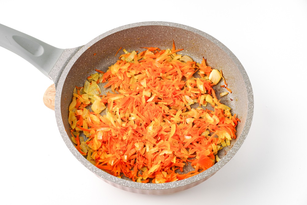 Разогреть сковороду, влить 1 столовую ложку растительного масла и хорошо прогреть. Выложить лук и морковь, обжаривать на среднем огне, помешивая, до мягкости и легкой золотистости. Не зажаривать сильно - овощи должны остаться нежными.