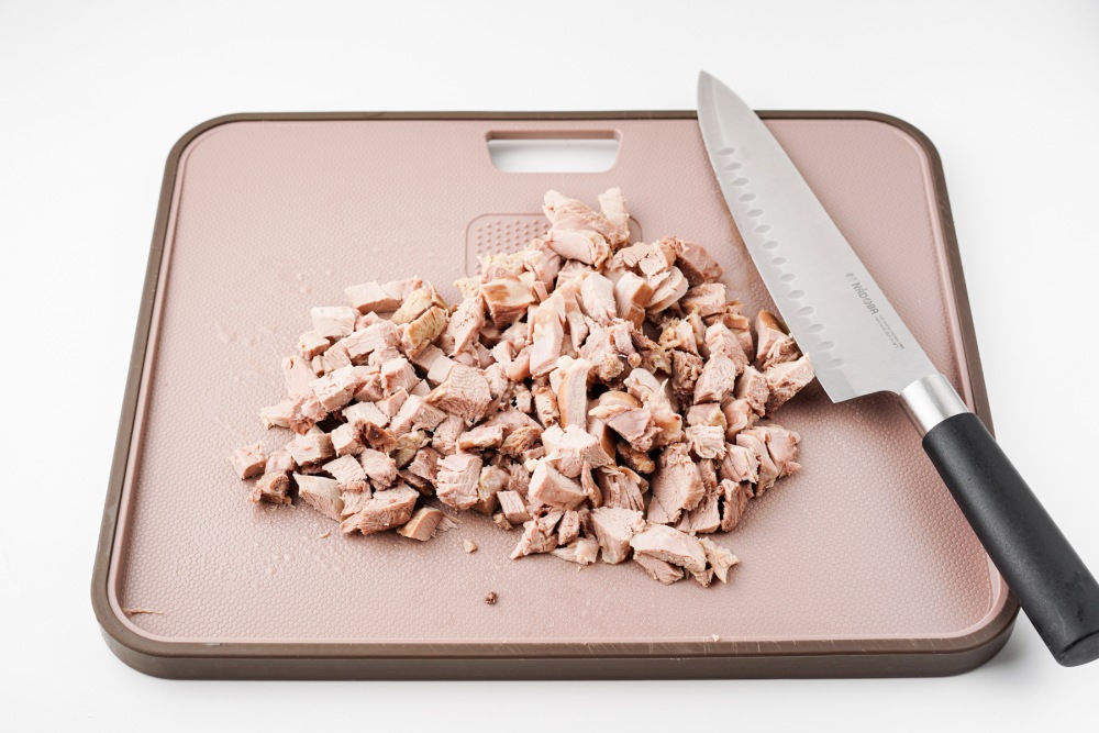 Отделить остывшее мясо от кости, удалить кожу и лишний жир. Нарезать мясо небольшими кубиками или разобрать руками на волокна. Добавить индейку обратно в кастрюлю и перемешать.