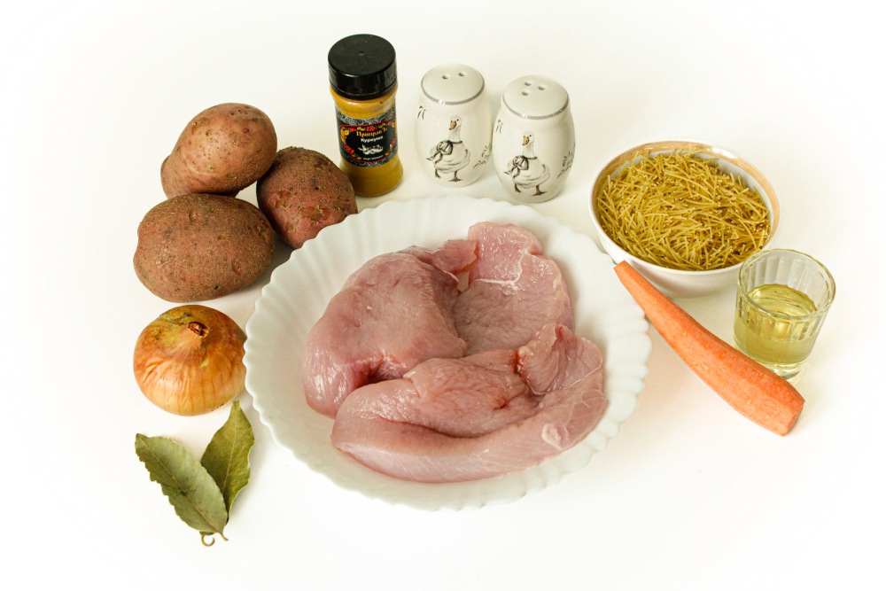 Подготовить ингредиенты. Выбрать мясо индейки на кости (голень, крылья или четверть тушки) или же грудку (если хочется более диетического), подготовить морковь, картофель, лук, вермишель (лучше мелкую), пару веточек укропа или петрушки, лавровый лист, чёрный перец, куркуму (по желанию, она придает красивый желтоватый оттенок бульону) и соль по вкусу.