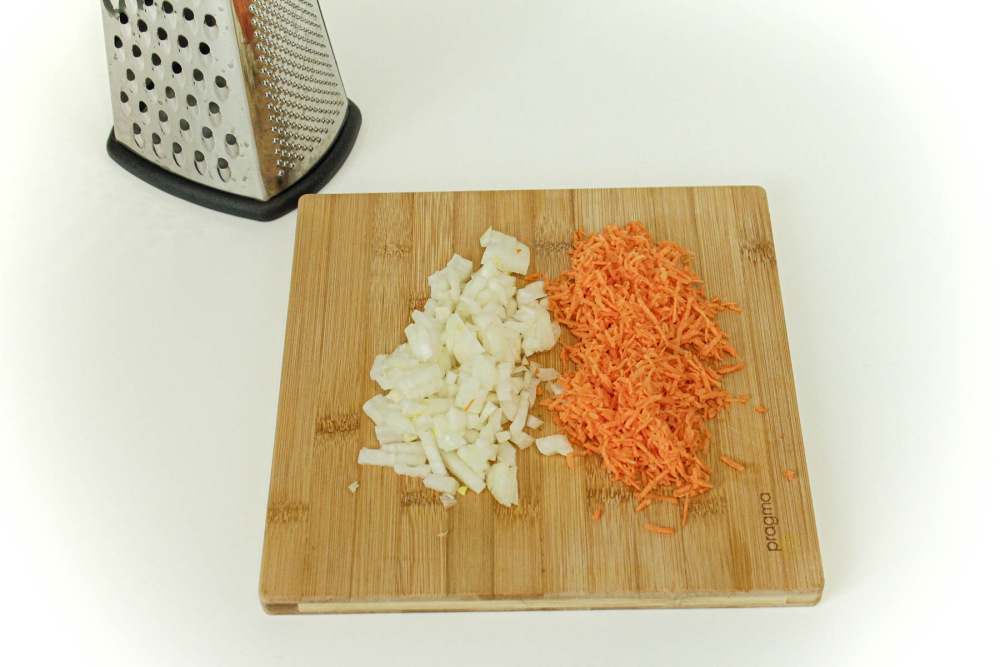 Очистить лук и морковь от кожуры. Морковь натереть на терке, лук нарезать кубиками.