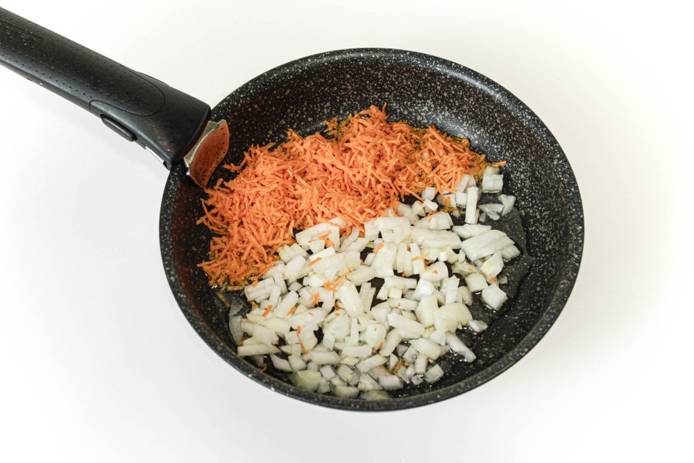 Пока мясо вариться, сделать зажарку. В разогретую сковороду налить растительное масло (можно взять сливочное) и отправить овощи жариться на среднем огне/мощности (примерно 5-7 минут) до прозрачности лука и мягкости моркови.