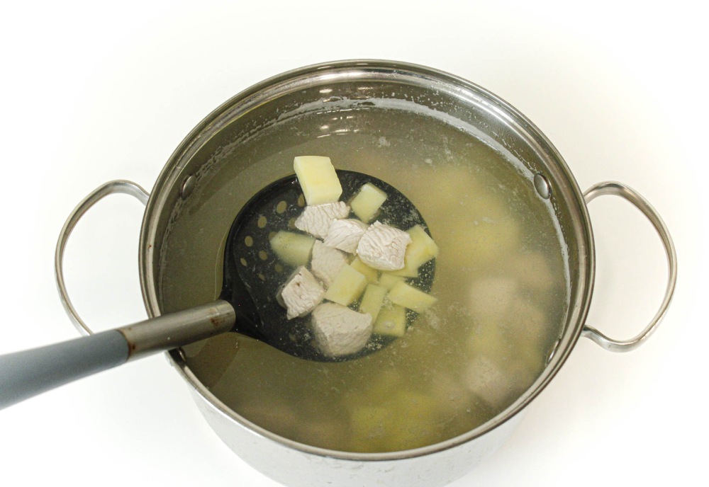 Добавить в суп картофель, варить до его мягкости, примерно 15–20 минут (зависит от сорта картошки и размера кусочков) на медленном огне/мощности (2-3 для индукции).
