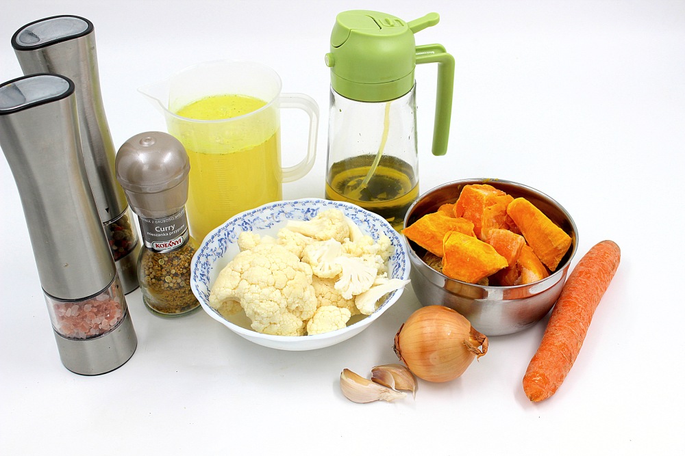 Подготовить ингредиенты для супа-пюре из тыквы и цветной капусты.