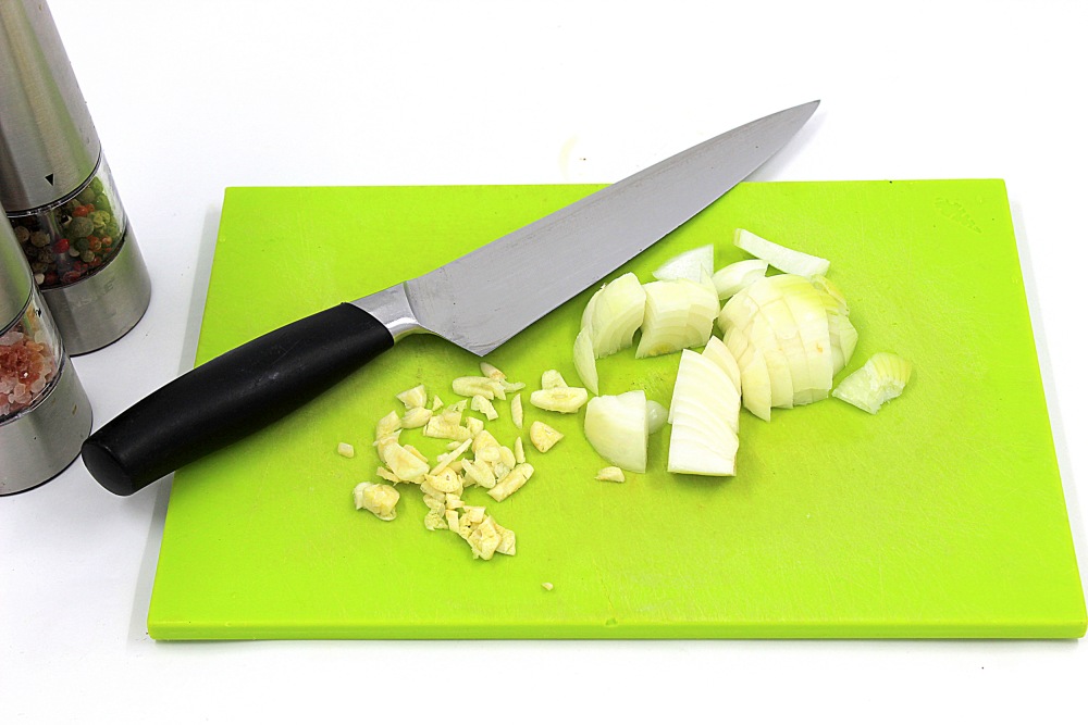 В кастрюлю с толстым дном добавить масло и минуту-другую обжаривать лук. После добавить чеснок, морковь и еще на пару минут продолжить обжарку.