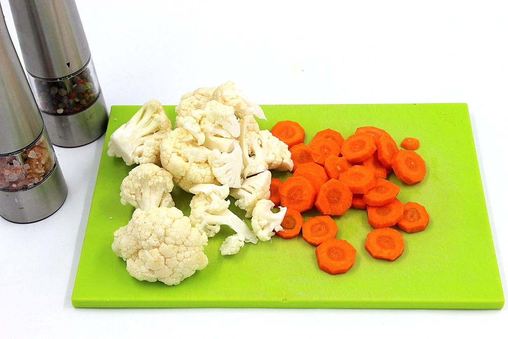 Очистить и нарезать не толстыми кружками морковь, а большие соцветия цветной капусты разрезать на 2-4 части.
