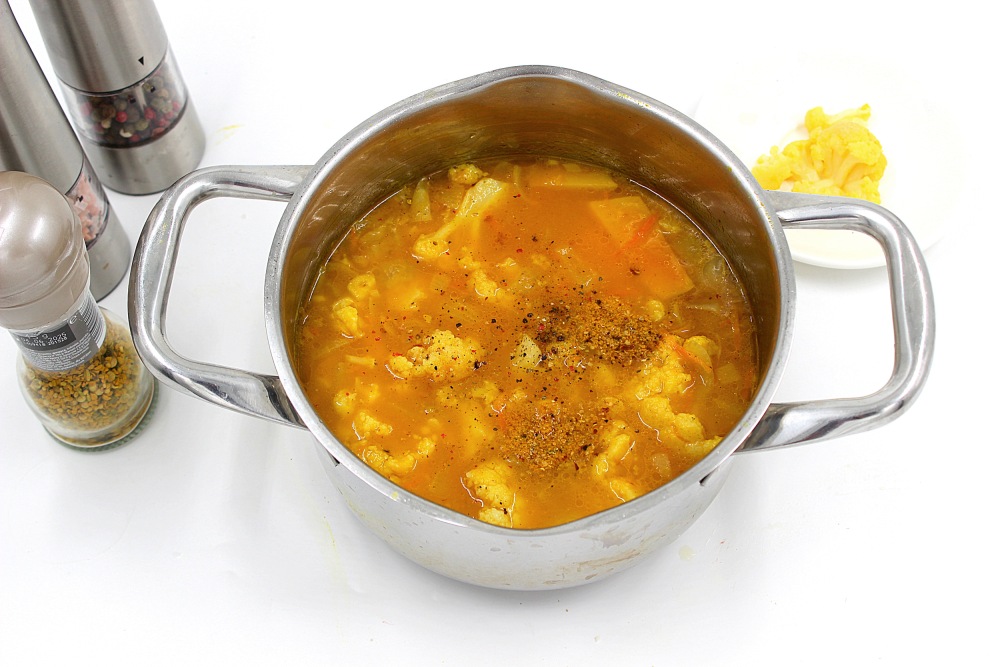 Добавить карри, перец и соль по надобности. Проварить еще 5 минут, до полной мягкости овощей.