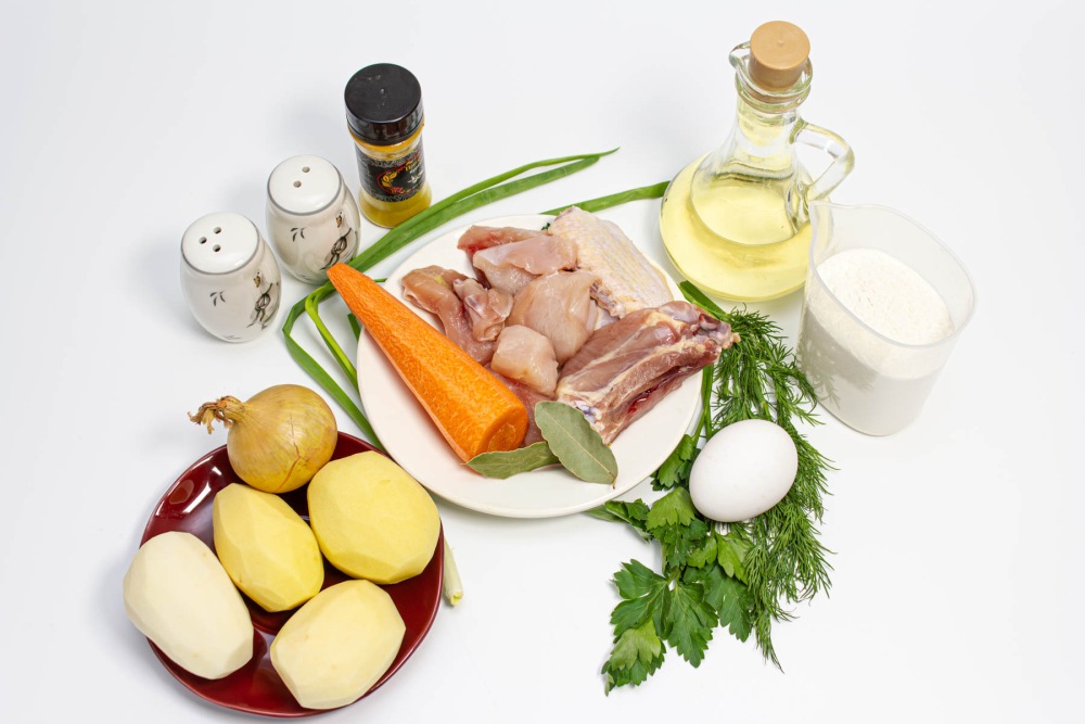 Подготовить ингредиенты для классического cупа затируха с курицей на яйцах.