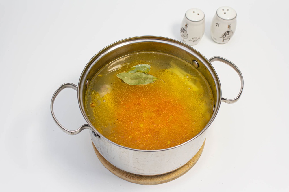 Переместить обжарку из моркови и лука в кастрюлю с бульоном. Досолить, если это необходимо, поперчить и добавить лавровый лист. Поставить варить на медленный огонь.