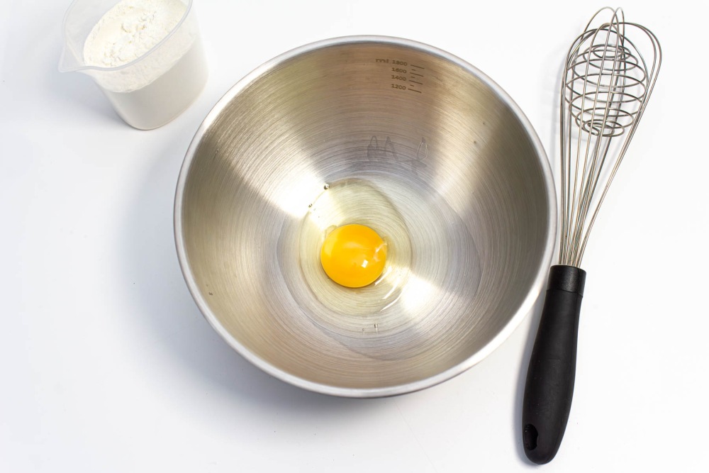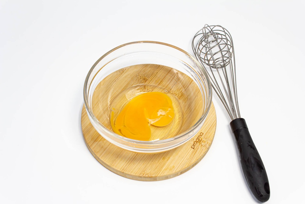 Взять яйцо категории С0 желательно, промыть под водой, промокнуть салфеткой и разбить в подготовленную посуду.