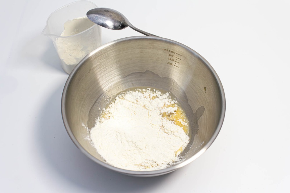Просеять пшеничную муку в яичную смесь.