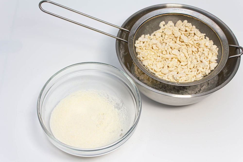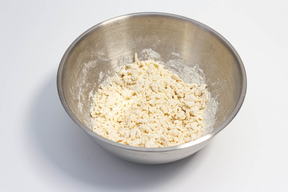 Замесить крутое тесто. Руками измельчите его пальцами до мелких комочков («затирка»).