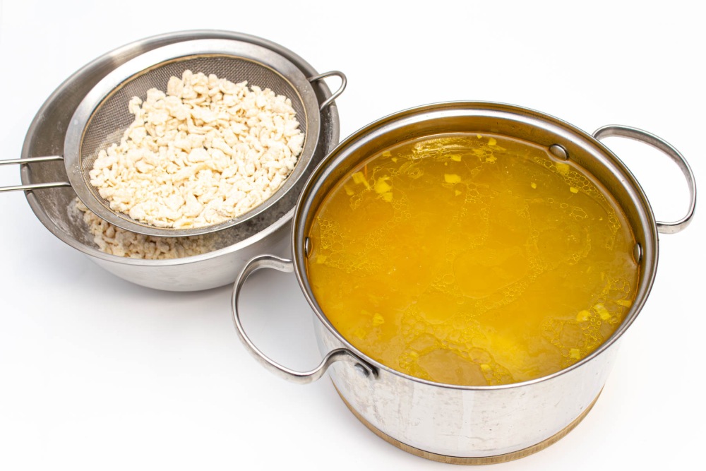 Когда затирка немного подсохнет (примерно 5 минут), просейте её через мелкое сито. Это нужно, чтобы бульон был "чище".