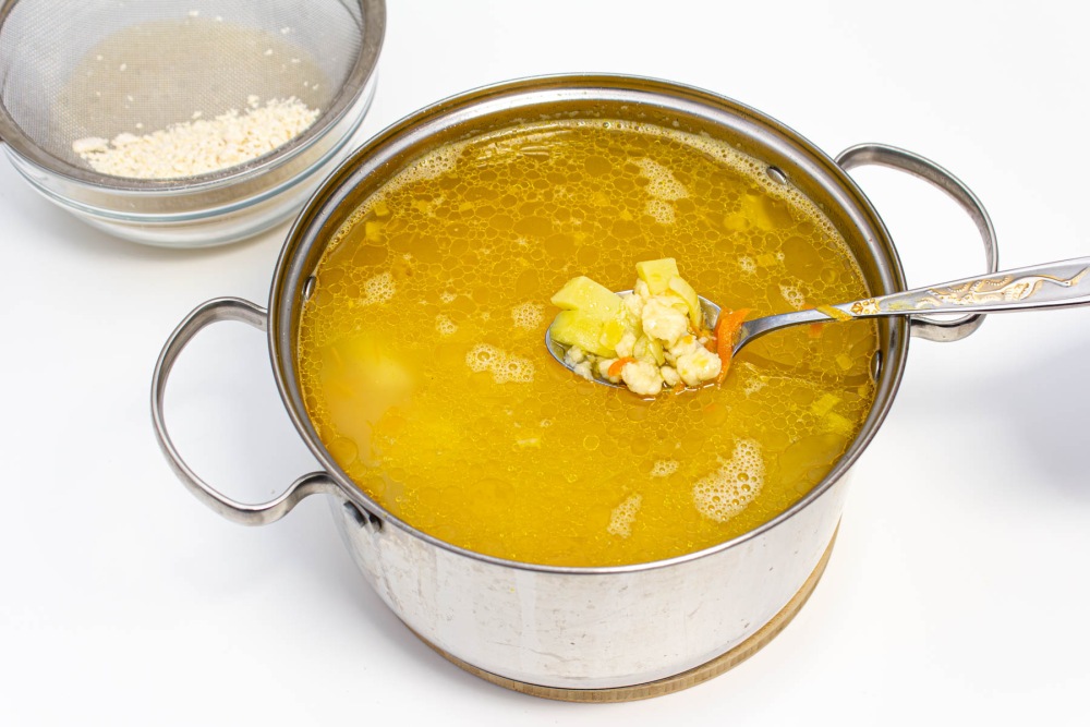 Аккуратно ввести затирку в кастрюлю с кипящим супом, помешивая ложкой, чтобы избежать образования крупных комков.