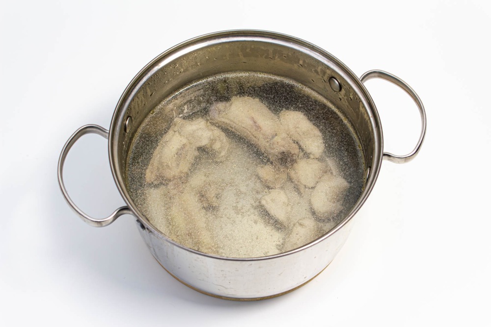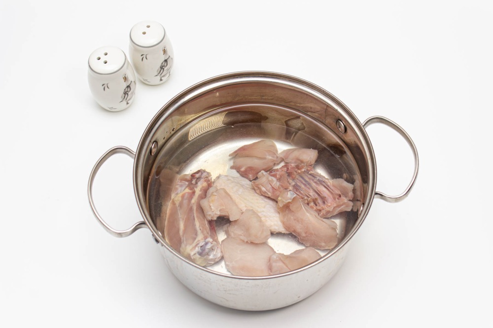 Тщательно промыть курицу, нарезать небольшими кусочками. Налить фильтрованную воду (3л.) в кастрюлю объемом 3,5л. Переместить подготовленную курицу в кастрюлю с водой и довести до кипения (примерно 30 минут на среднем огне/мощности)