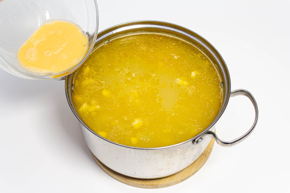 Тоненькой струйкой влить размешанное яйцо в кипящий суп, постоянно его размешивая. Оставить суп покипеть на среднем огне около минуты.