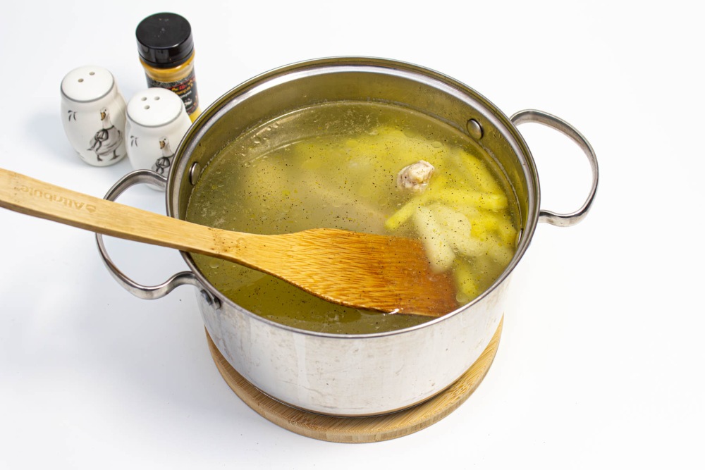 Когда мясо будет готово добавить картофель в кипящий бульон. Добавить соль по вкусу. Продолжать варить ещё 10-15 минут.