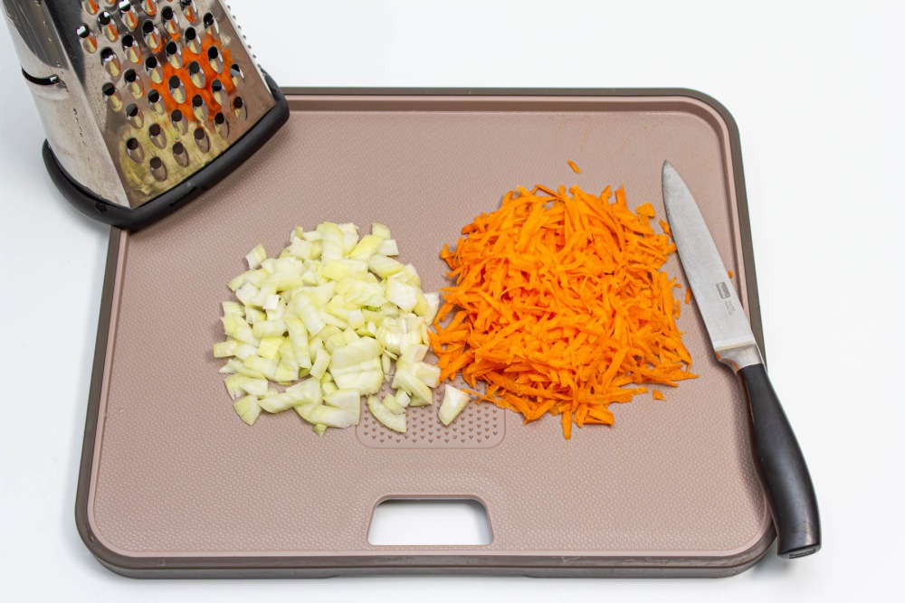 Морковь натереть на крупной терке, лук нарезать кубиками.