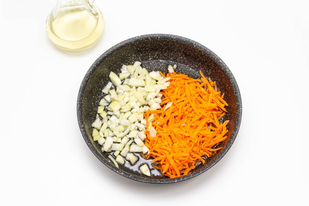 Растительное масло влить в сковороду. Обжаривать лук и морковь на среднем огне/мощности в течении 5-7 минут, периодически помешивая.