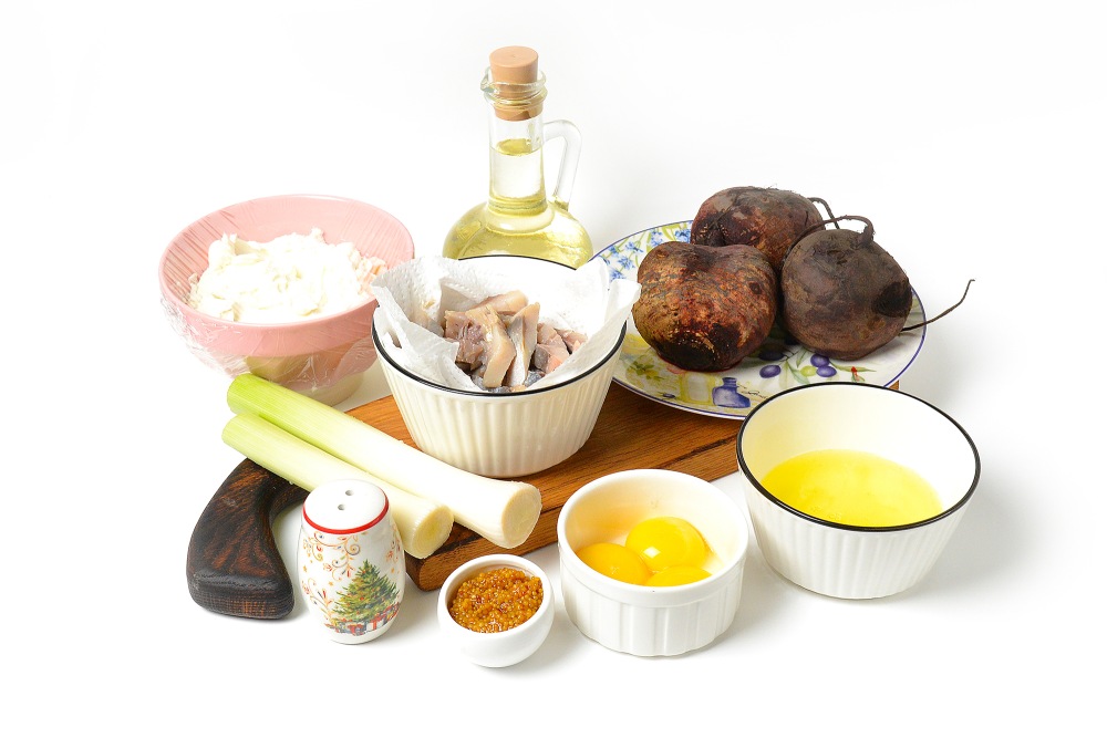 Подготовить ингредиенты. Свеклу запечь заранее, также потребуются яйца, творожный сыр, селедка, зернистая горчица и лук-порей. Для коржа нужна мука и немного соли.