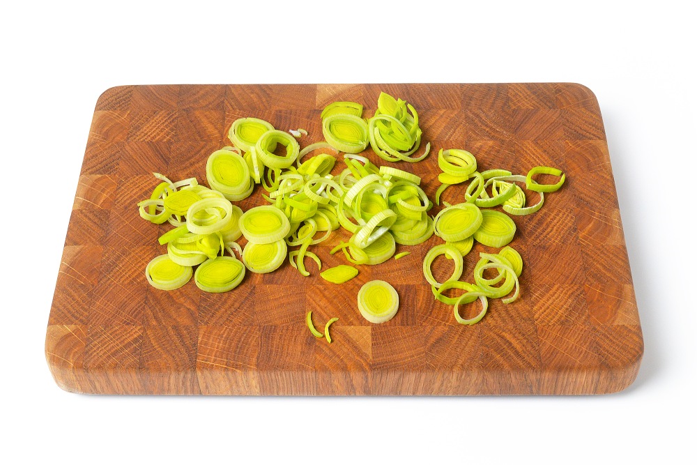 Нарезать лук-порей кольцами. Корж остывает при окружающей температуре 20-22 градуса около 1 часа.