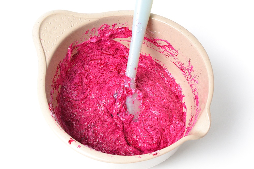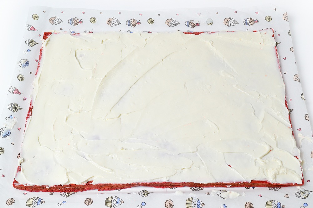 Сыр перемешать в миске до однородности, чтобы сделать его более воздушным. Покрыть сыром остывший свекольный корж. Край отступать не нужно.