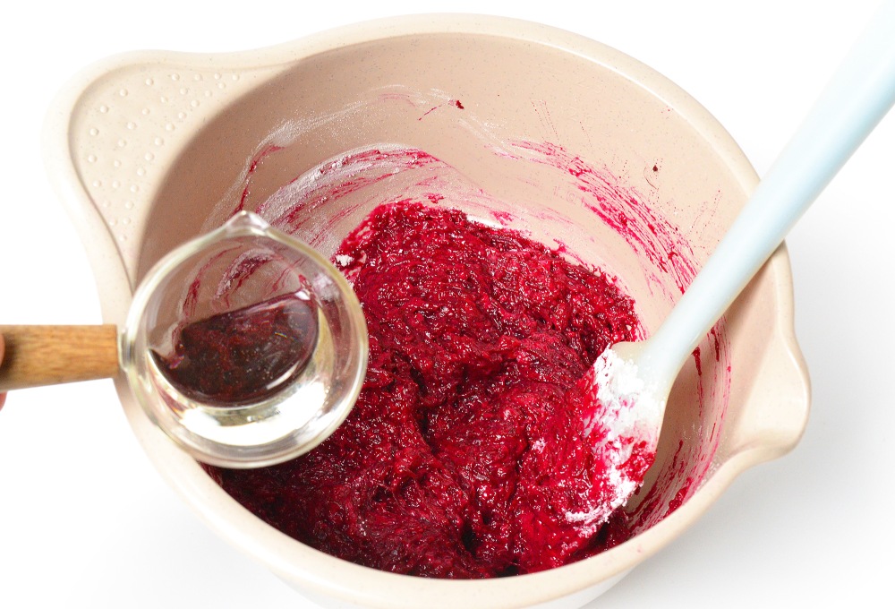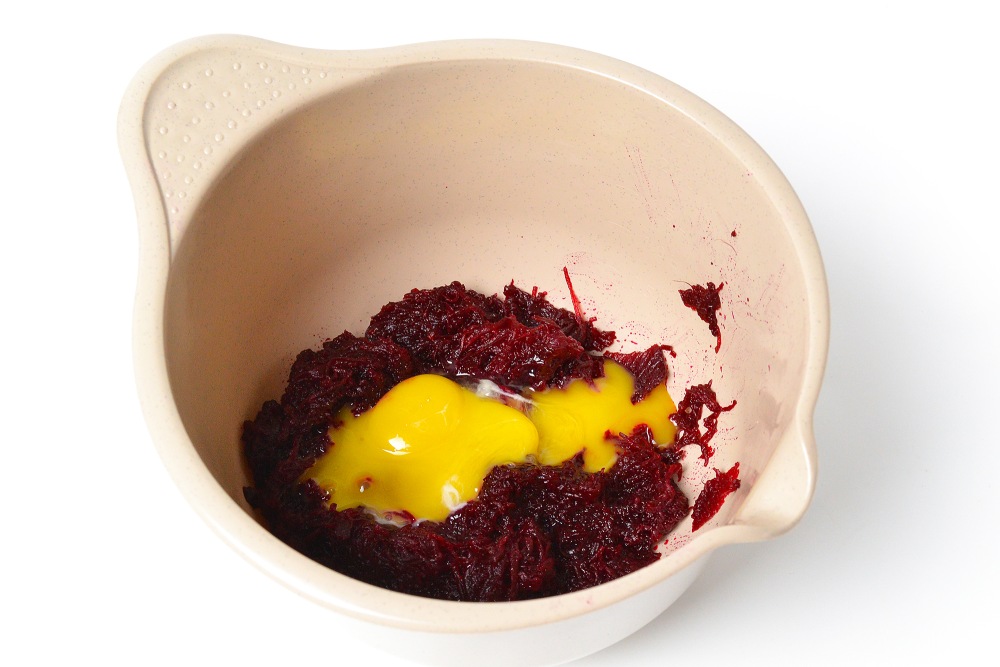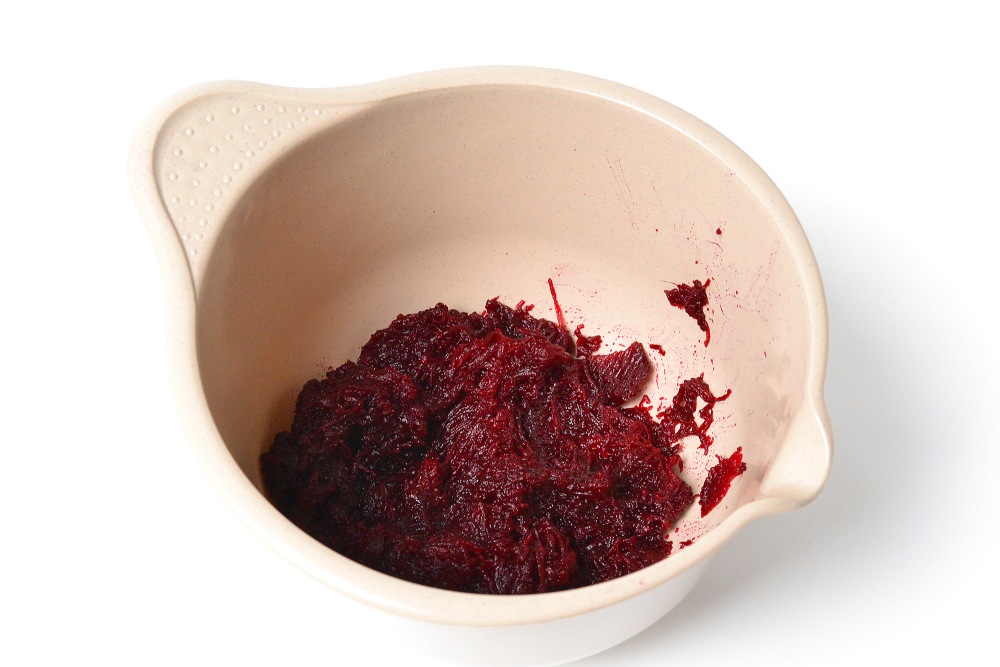 Полностью остывшую свеклу натереть на мелкой терке в миску, где будет замешиваться тесто для коржа.