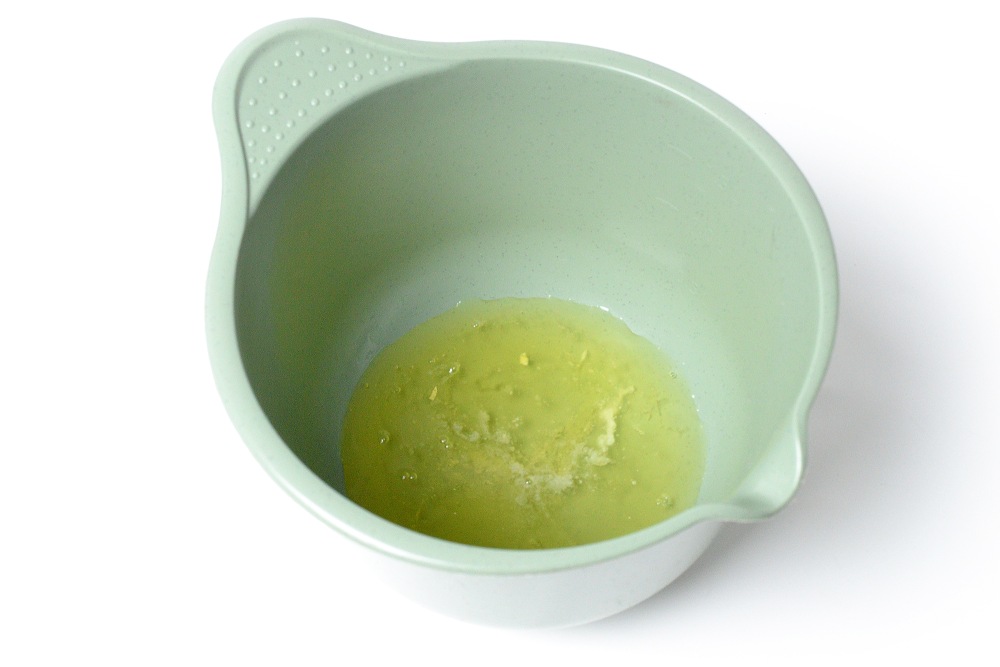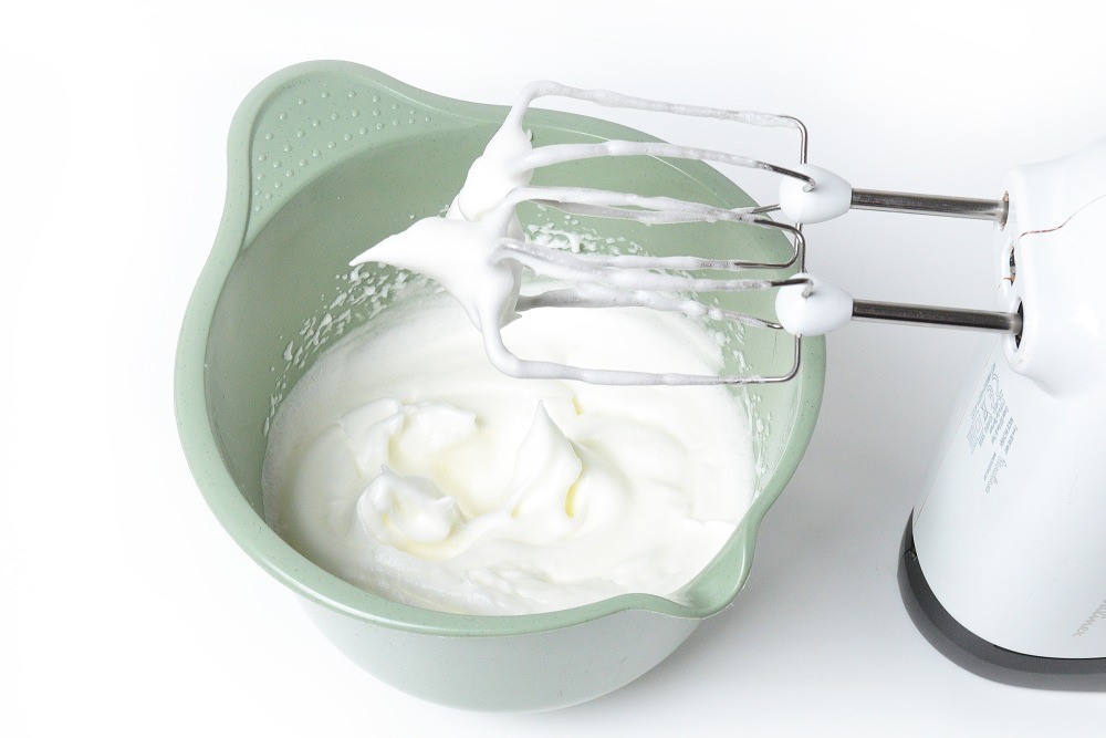 Взбить на оборотах чуть выше среднего до пышных пиков.
