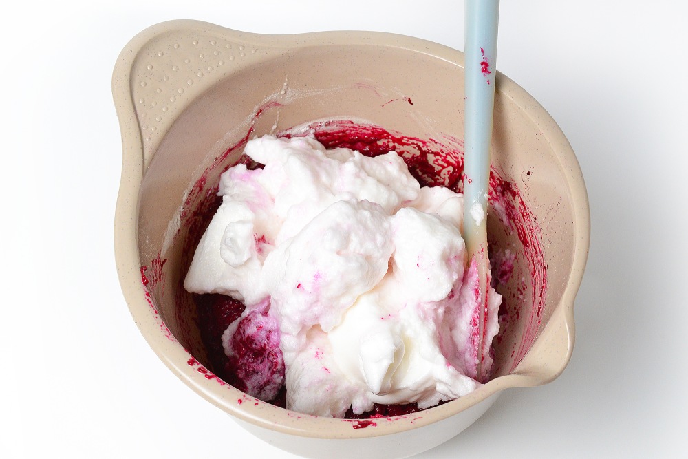 Выложить белки в 2-3 этапа и перемешать лопаткой снизу вверх, словно переворачивая тесто.