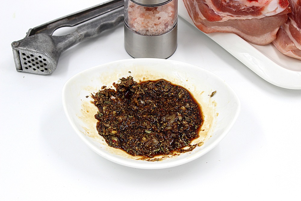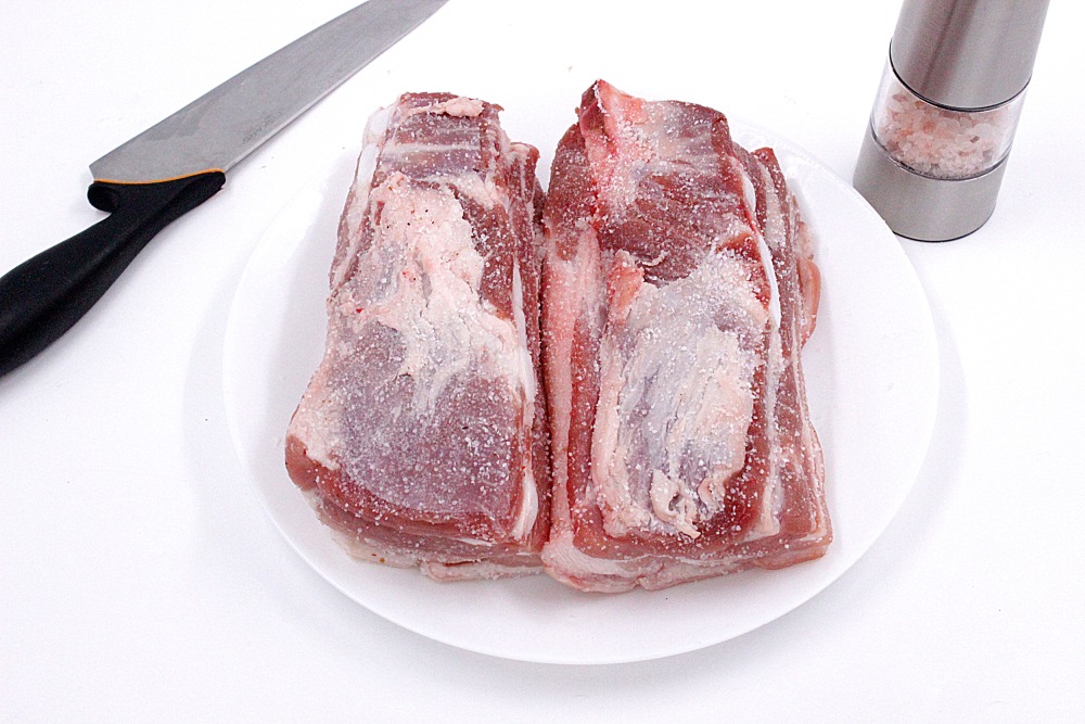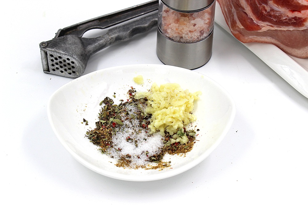 Далее натереть свиную грудинку смесью приправ и оставить мариноваться на ночь или сутки.